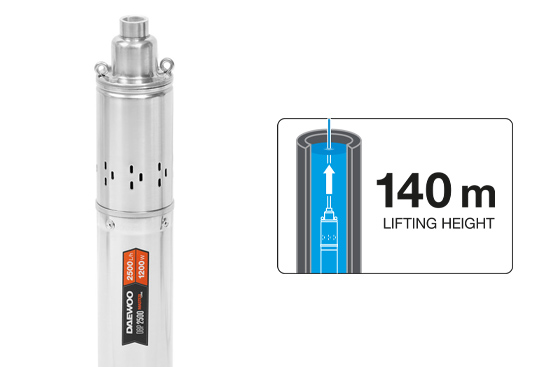 Насос способен подавать воду на впечатляющую высоту до 140 метров, обеспечивая эффективный подъем жидкости из глубоких скважин.