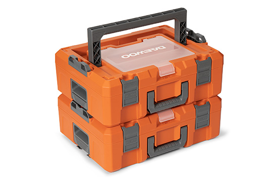 Кейс выполнен из прочного пластика в виде систейнера с замками, обеспечивающими быструю и надежную установку кейсов один над другим, что облегчает транспортировку и способствует экономии пространства для хранения. Отдельный отсек на корпусе кейса позволяет удобно переносить необходимую оснастку.